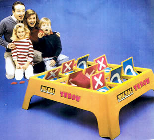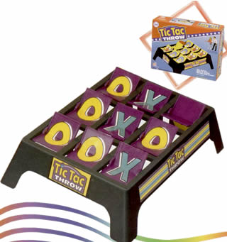 A game of skill and luck as player toss bean bags at the giant TIC TAC Throw board, trying for 3 in a row.