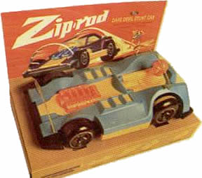 Number: 4119-4 Realistically designed stunt cars that the kids will really flip over! Just zoom a Zip Rod out in front with the special zip rod handle . . . the action is a lot like bowling, but watch the car go! Any surface will do, and once released it does everything a real hot rod does—spins out, flips over, or zips straightaway to the finish. The cars are engineered so that the hot rodder himself can set the gears and call the action at distances up to 50 feet. The cars are nine inches long, of a molded-body construction. The cars come with rollover safety bars and the vehicles come in exciting racing colors like the real thing.